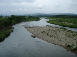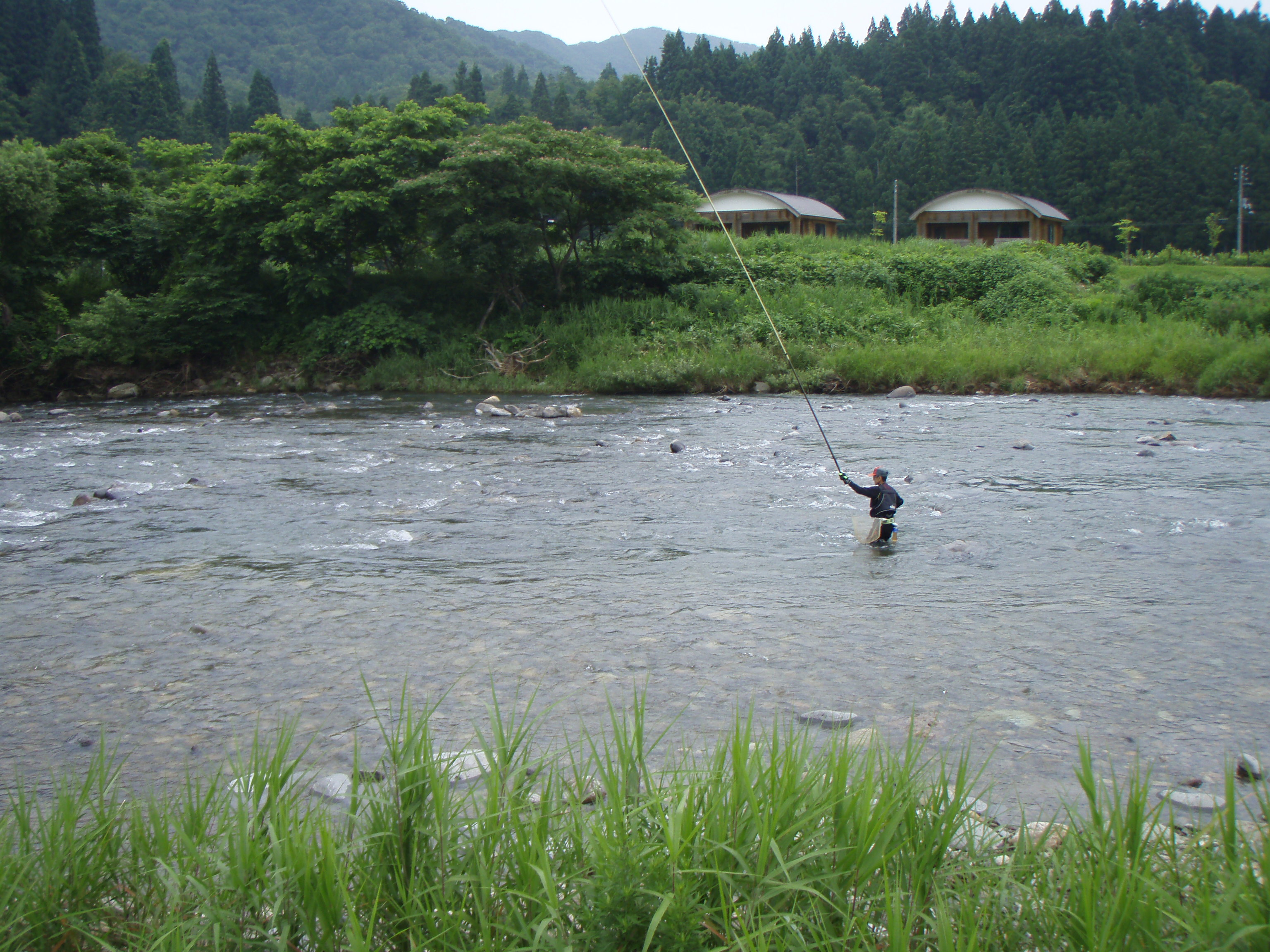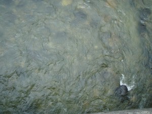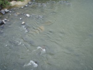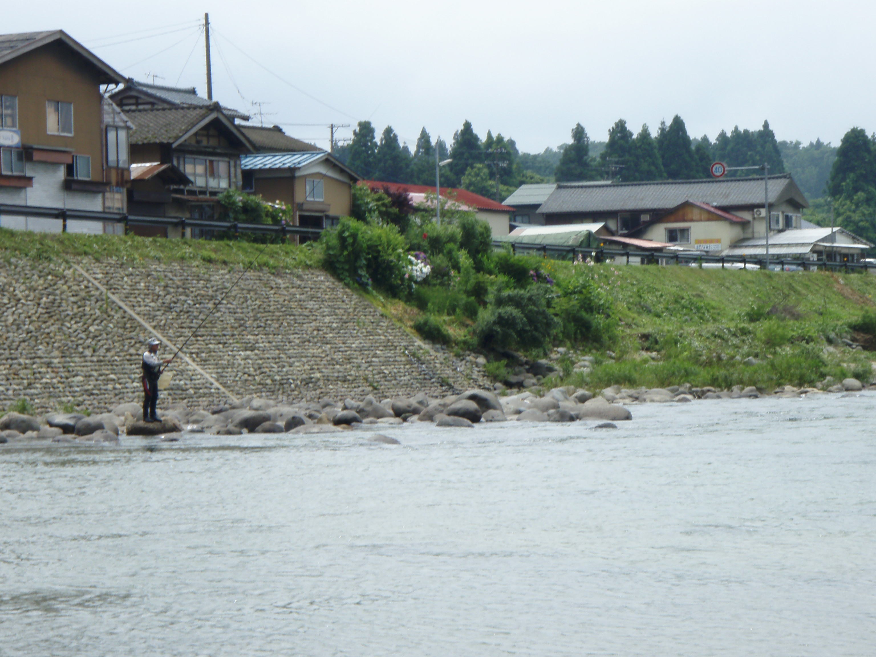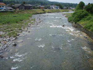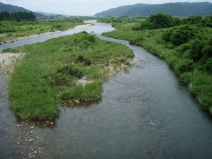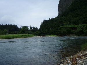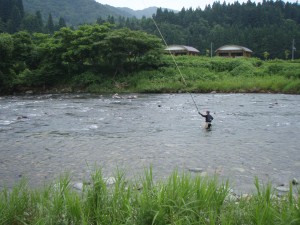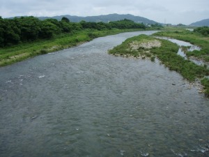 橋の上から見ると上下流共凄い数のアユが群れているが掛からない。