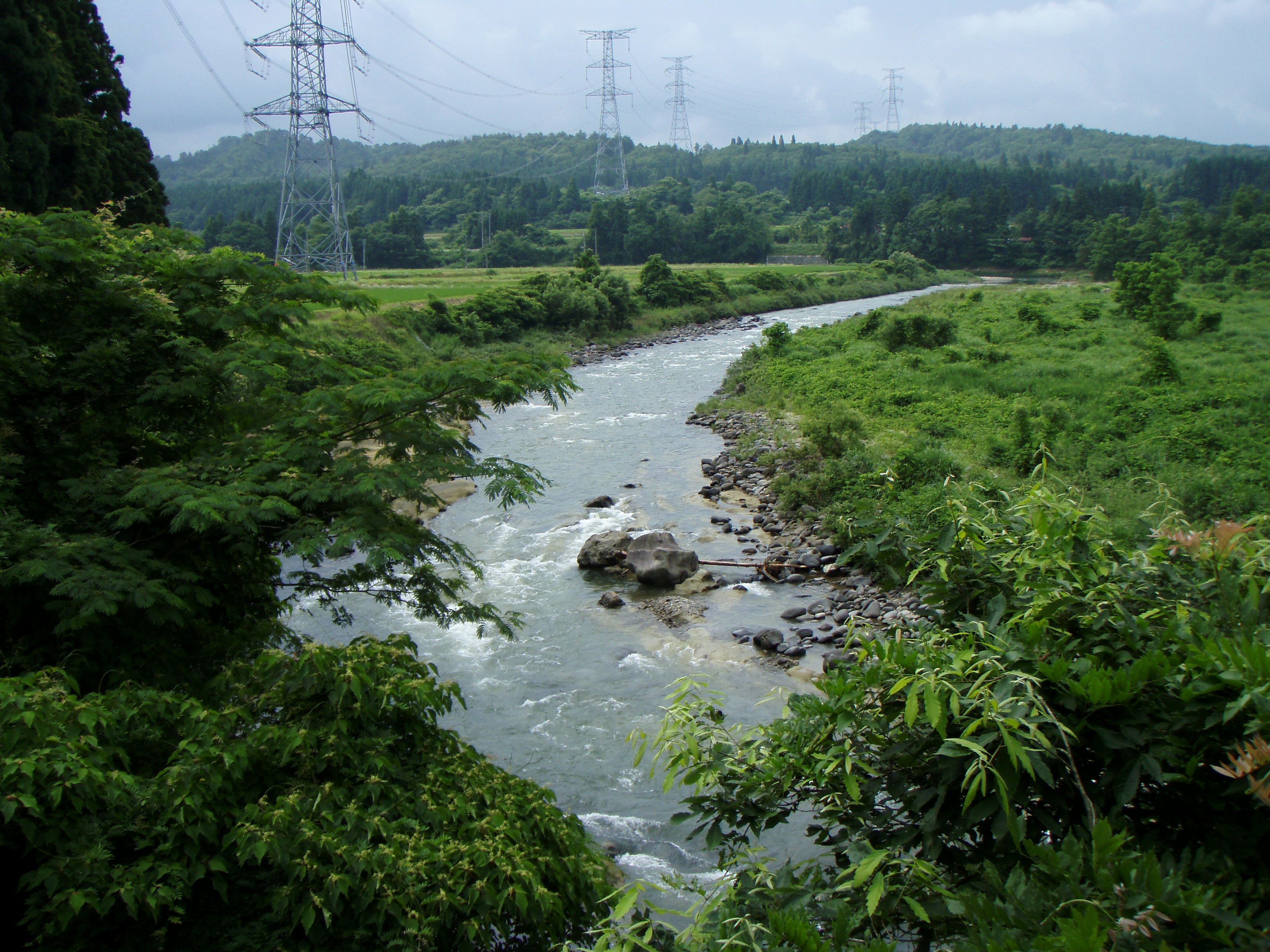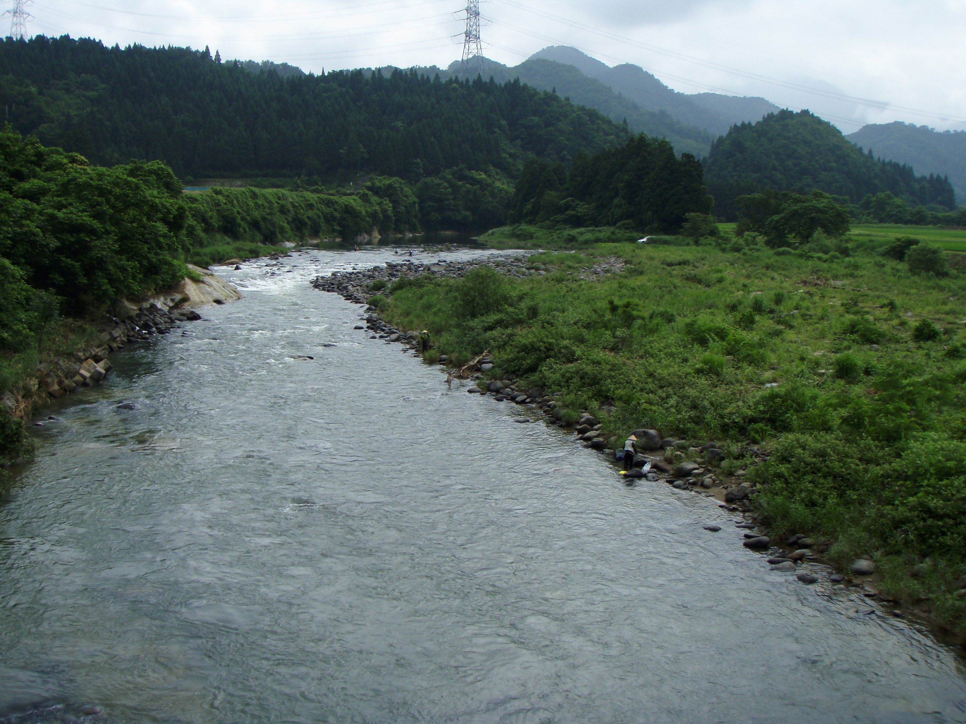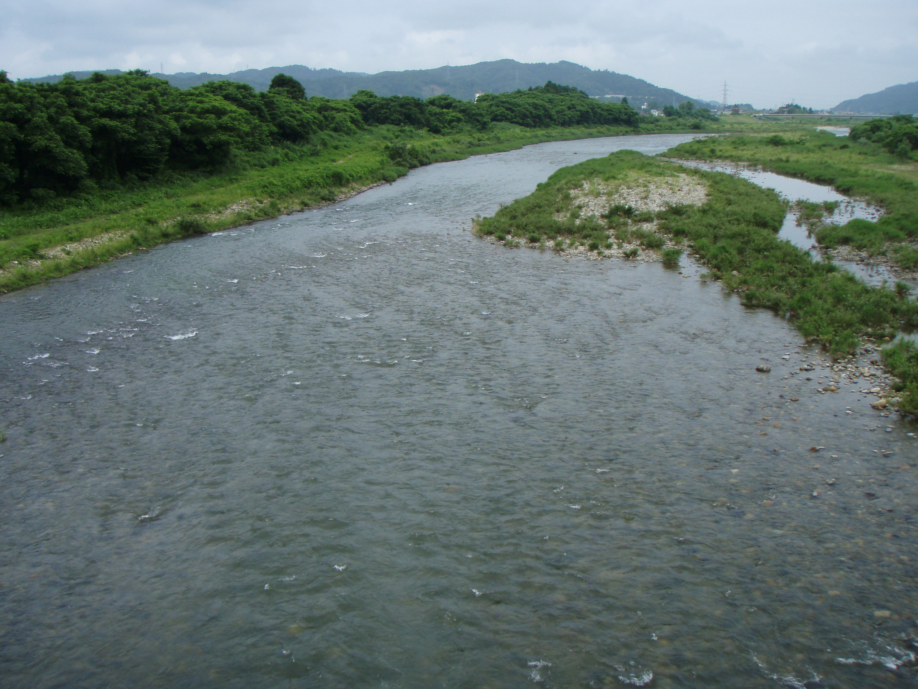 橋の上から見ると上下流共凄い数のアユが群れているが掛からない。
