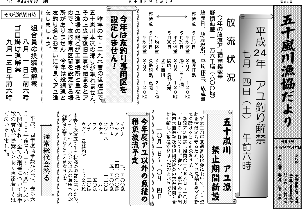 五十嵐川漁協便りH24号外ができましたので掲載します。