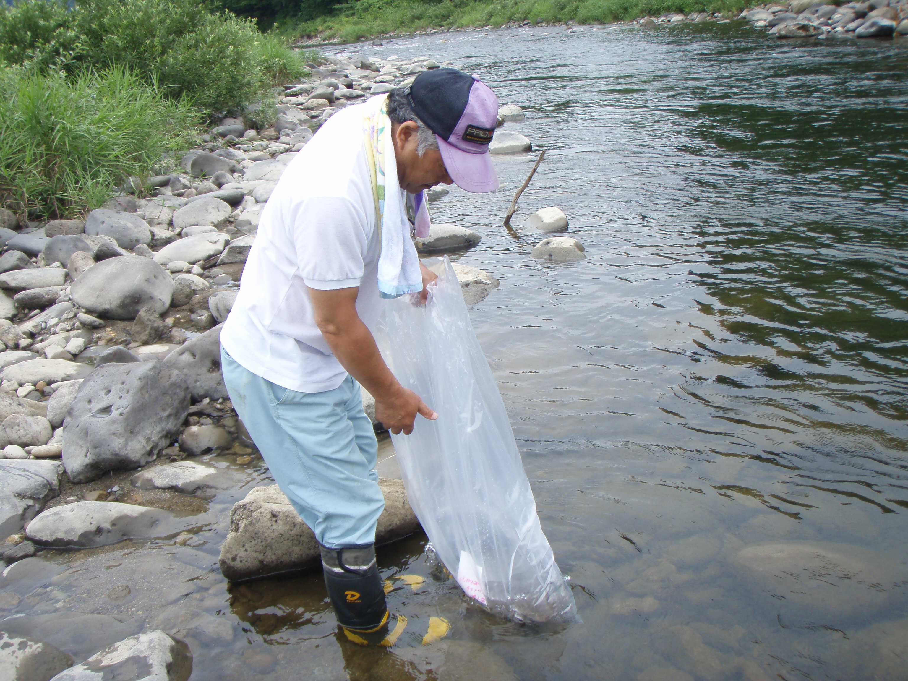 7月29カジカ稚魚5,400尾を駒出川と五十嵐川元町送電線付近に放流しました。
